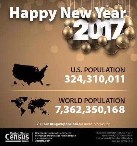 美國人口調查局給出的預測顯示,到2017年1月1日,全球人口將達到7,362,350,168人,較去年同期增長1.07%。美國的人口總數為324,310,011,較去年同期增長0.7%。2017年1月,全球平均每秒將有4.3人出生,1.8人死亡。(美通社,2016年12月28日華盛頓)