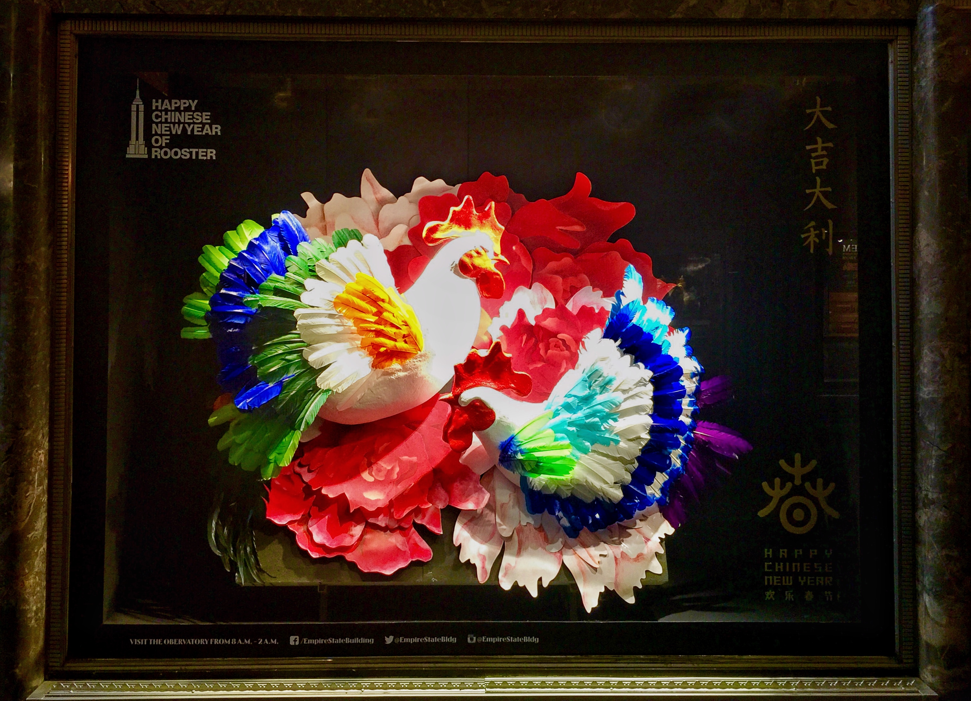 為慶祝雞年春節(jié)的到來,帝國大廈將專為中國農(nóng)歷新年亮燈并進(jìn)行新年倒數(shù),并推出一年一度的春節(jié)櫥窗展,分別以“金雞報(bào)曉”、“大吉大利”、“金雞納福”為主題,為觀眾呈獻(xiàn)融合當(dāng)代特色的立體中國年畫。2017年1月26日至27日,專為中國農(nóng)歷新年打造,由中央美術(shù)學(xué)院設(shè)計(jì)的“普天同慶”新春燈光秀將于帝國大廈舉世聞名的塔頂特別呈現(xiàn)。(美通社,2017年1月24日紐約)