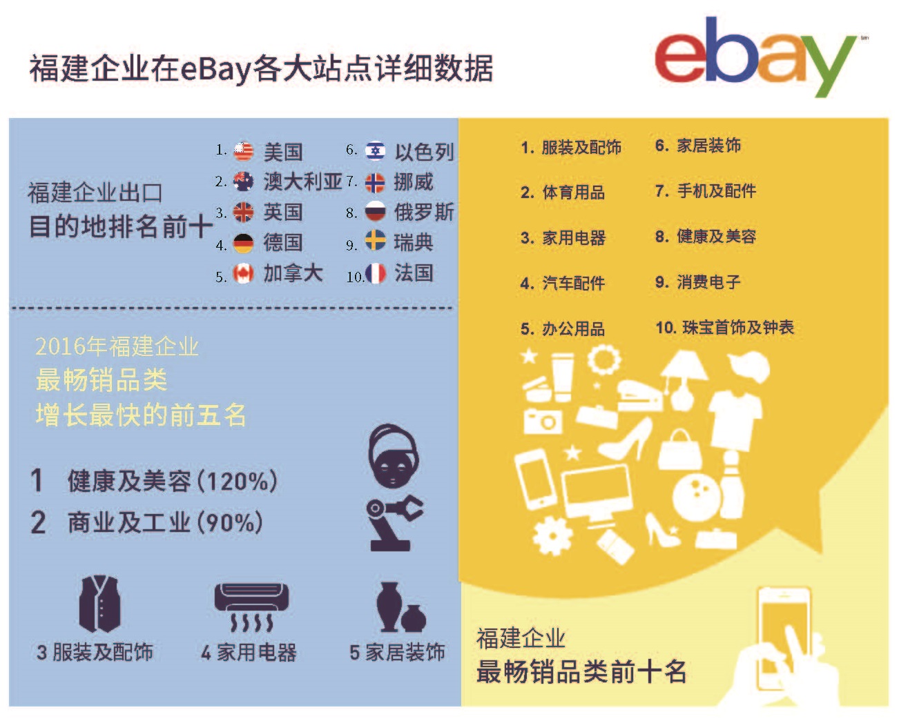 eBay與福建省商務廳、福州市人民政府共同簽署了戰略合作協議。三方將攜手合作實現優勢資源整合,重點推動福建省跨境電商出口產業在政策扶植、人才培養、產業優化和物流基建等領域的創新發展。據eBay內部數據顯示, 在2016年,福建跨境電商零售出口企業通過eBay平臺將產品出口至200多個國家和地區,其中,排名前三的出口目的地市場分別為美國、澳大利亞和英國。在暢銷品類方面,服飾配件、體育用品、家用電器、汽配和辦公用品分別居銷售榜前五位。(美通社,2017年4月7日福州)