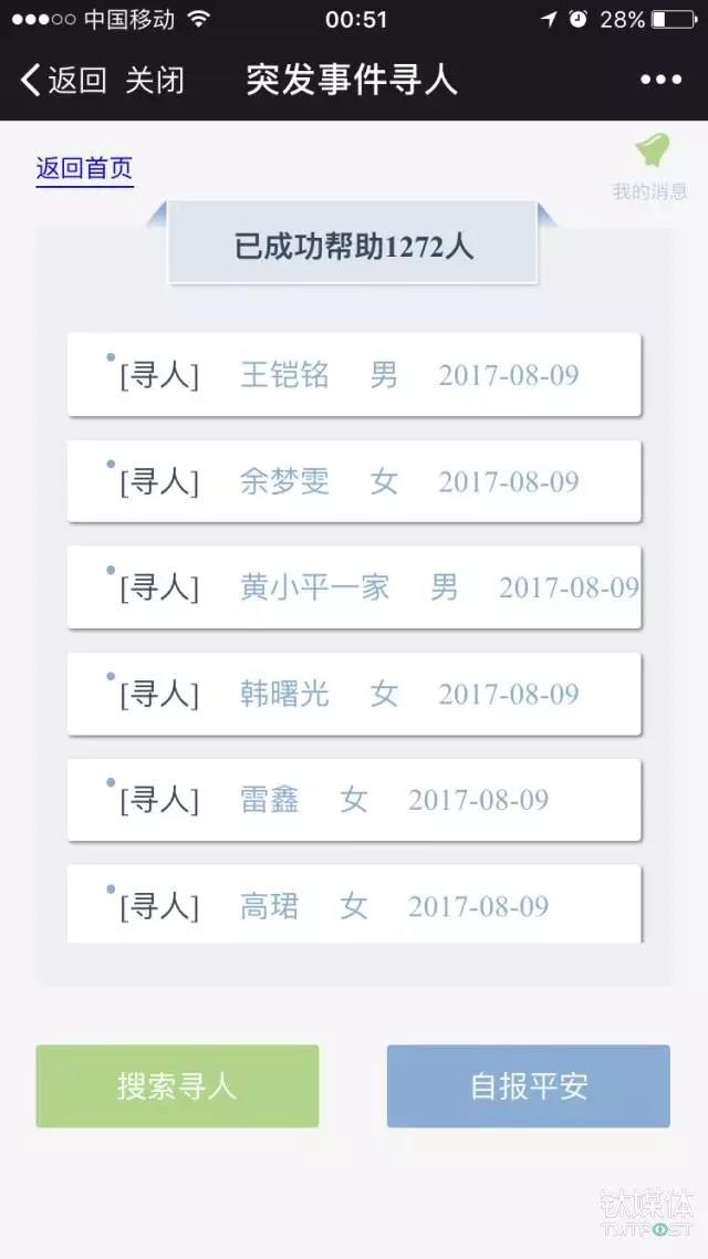 這個動作在此次九寨溝縣地震中被“今日頭條”率先承擔(dān),在昨晚的今日頭條 APP 與微信公眾號里,接連推出“地震尋人服務(wù)”的 H5頁面,通過朋友圈轉(zhuǎn)發(fā)與今日頭條本身的流量入口,提供“搜索尋人”與“自報平安”兩大功能,而在上線的當(dāng)晚,該頁面已經(jīng)為1272人提供了相應(yīng)服務(wù)。