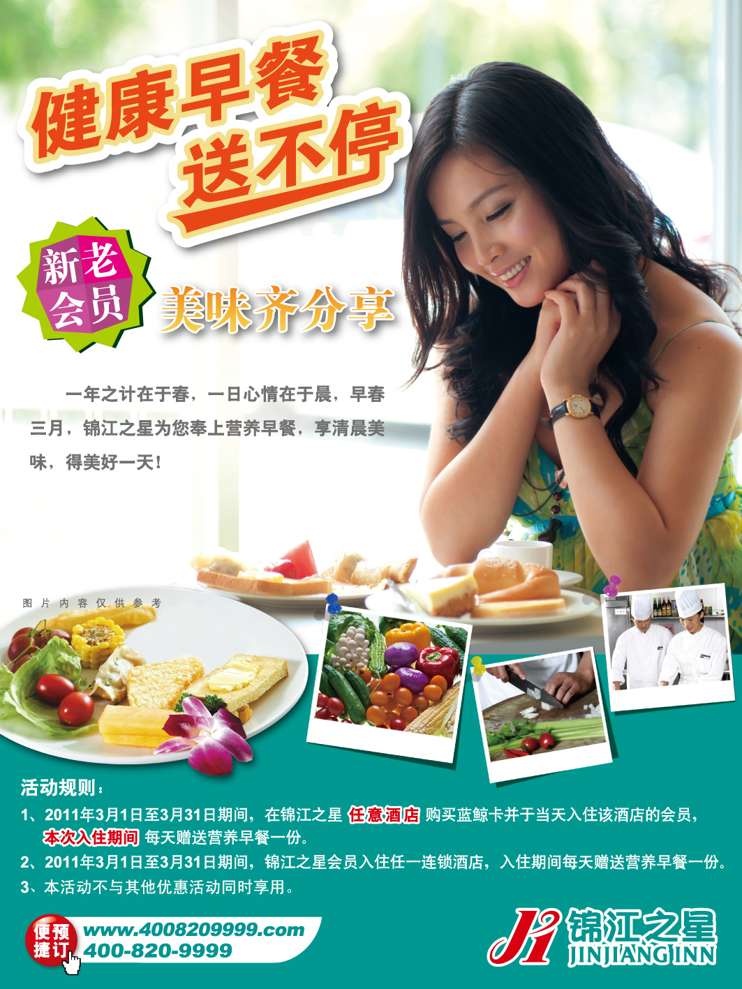 此次為了回饋廣大新老會員,繼“千萬獎品別錯過(第二季)”春節(jié)特惠活動之后,錦江之星將于2011年3月開展“健康早餐送不停,新老會員齊分享”主題優(yōu)惠活動,為會員送上超值大禮,同時也是對廣大會員真誠關(guān)懷的體現(xiàn)。