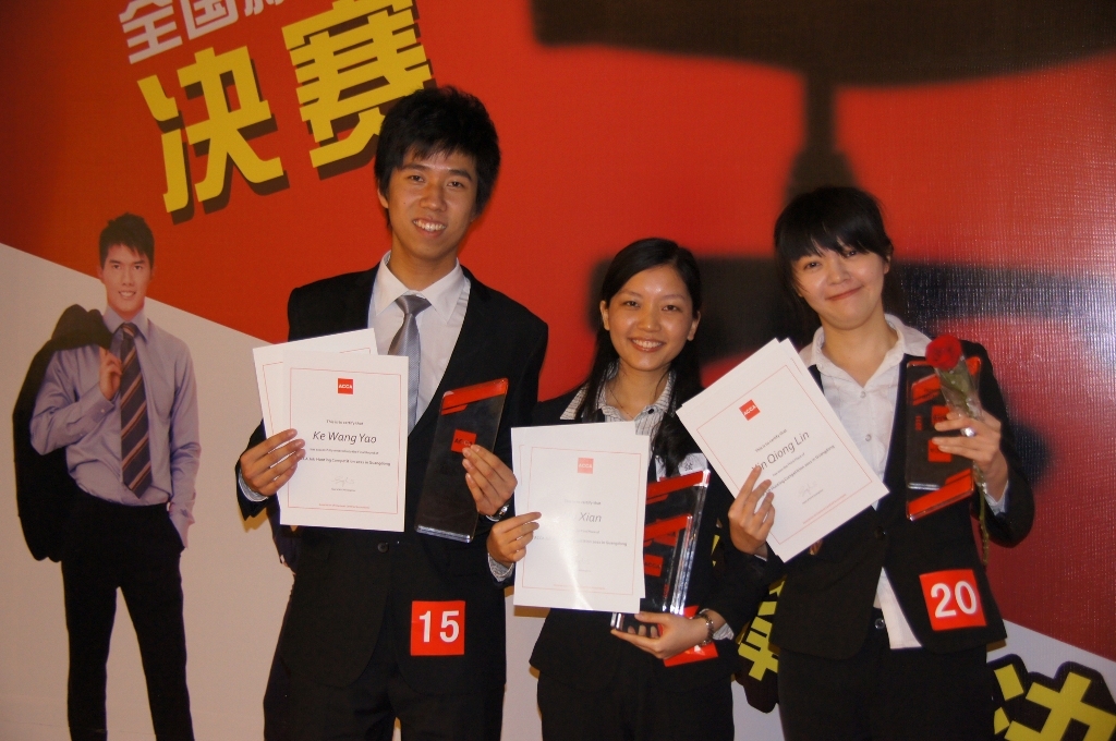 胡弦同學是暨南大學國際學院的大三學生,在班級中成績排名在前2%。她出眾英語能力深受評委們贊賞,此前還曾獲得廣東省大學生英語演講比賽第一名和全國 CCTV 英語演講比賽優勝獎。決賽之前,她就曾經在4月16日 ACCA 就業力大比拼前20選手“職業訓練營”的人際交往練習環節中獲得選手們共同票選的第一名。當時選手們的職業訓導導師程煜麟先生總結了選手們的意見,認為胡弦獲勝的原因在于她在與人交談時始終表現出淡定、大方、誠懇和自信,讓與之交談的人感覺如沐春風。亞軍柯汪堯同學也是一名大三學生,現就讀于廣東外語外貿大學國際商務英語學院國際貿易專業,他在密鑼緊鼓準備比賽的同時還在廣交會實習,毅力過人的他克服了時間的困難,帶領比賽團隊出色地完成項目,最終以成熟自信的表現獲得評委一致好評。與亞軍來自同一學院的辛瓊璘同學是國際商務(全英班)的學生,她親切大方的形象、良好的團隊合作精神和敏捷的才思令評委們留下深刻印象。