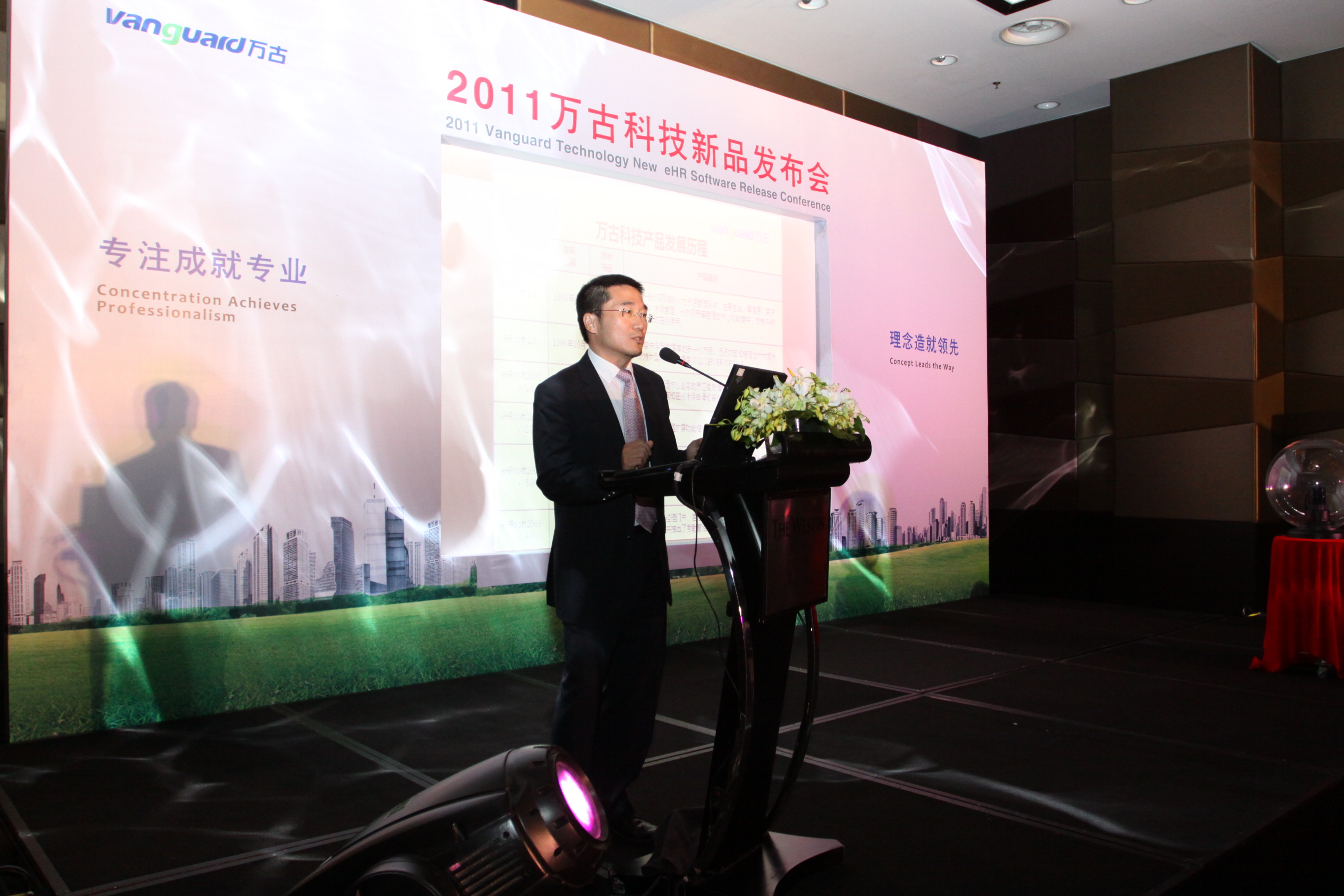 新品發布會在悠揚的音樂中開場,活動氣氛被成功調動。隨后,萬古科技總經理崔堃首先致辭。他表示:“萬古科技作為中國領先的 eHR 軟件和服務提供商,在13年的發展歷程中,秉承‘用戶第一’的服務理念,不斷創新始終走在行業的最前列。2002年我們率先發布基于 B/S 操作方式的 eHR 系統 eHRsoft2000,實現了全員人力資源管理。今天我們在這里發布 Vantop,這是一款‘有思想’的 eHR 系統,我們堅信它標志著未來中國 eHR 系統的發展方向。在此,也預祝萬古科技新產品發布會圓滿成功!”崔堃總經理的致辭令到場來賓對萬古科技即將發布的新產品充滿期待。