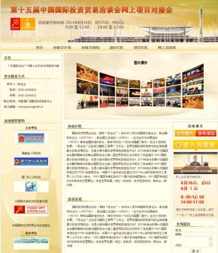 廣州2011年8月3日電 /美通社亞洲/ -- 第十五屆中國國際投資貿易洽談會將于9月8日-11日在廈門舉行,為幫助各機構拓展業(yè)務,提高項目對接服務質量,網上投洽會承辦方 -- 北京國富信科技有限公司(簡稱:國富信)協助98投洽會組委會承辦了“網上項目對接會”及“精品項目路演”活動。