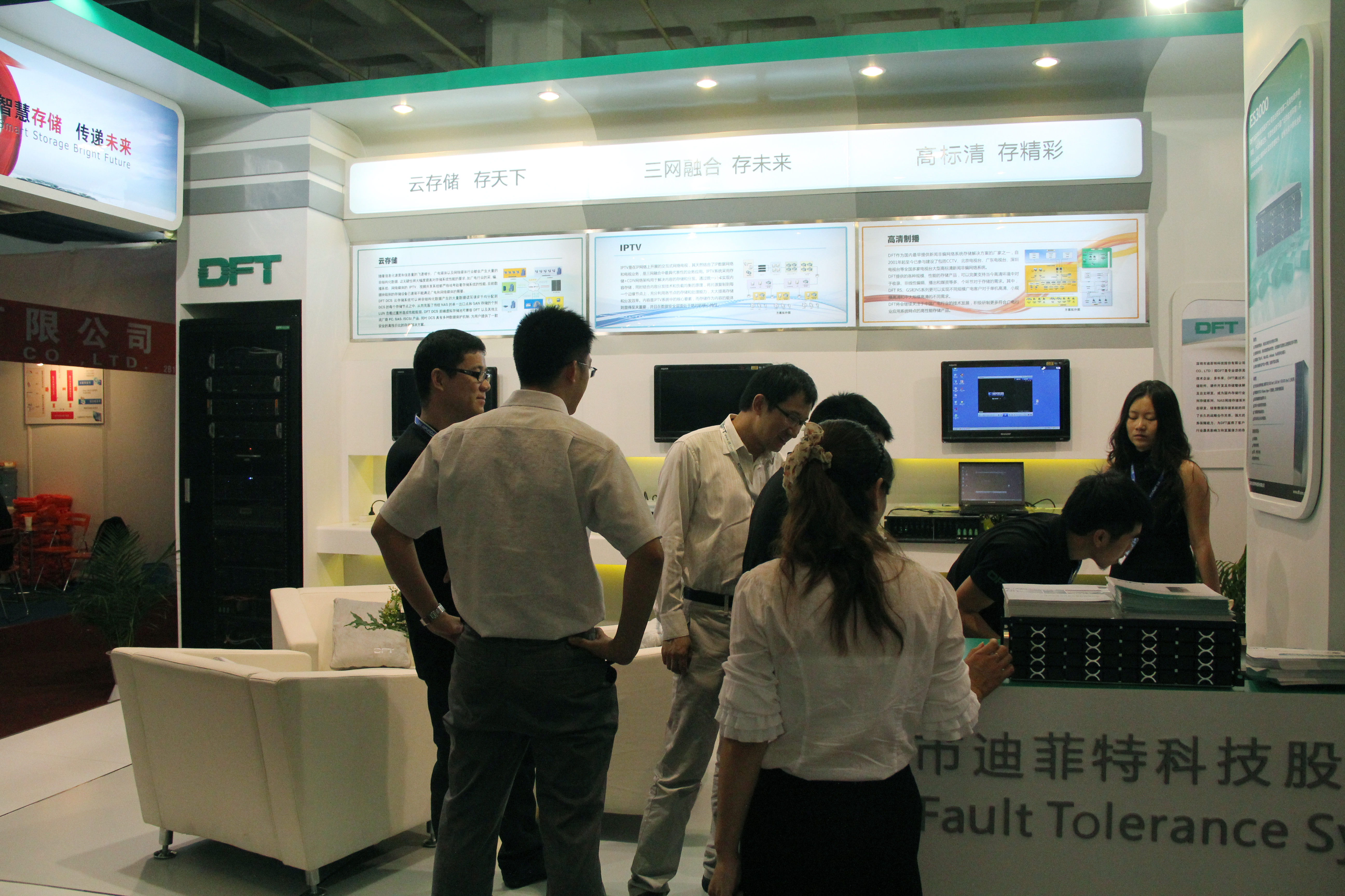 DFT 是國內知名的和極具發展潛力的存儲產品和解決方案供應商。自1998年成立以來,一直專注于廣電行業媒資、非編等行業應用以及各領域和各環節對存儲產品的應用和發展趨勢,并攜手中科大洋、索貝等行業知名 SI 為廣電行業客戶提供專業的個性化存儲解決方案。大會首日,甫一亮相的 DFT 展館即以新穎別致的造型吸引了眾多到場客商的目光,而豐富又直擊行業熱點技術的產品和解決方案更是讓所有觀眾駐足。DFT 展臺的 IPTV、云存儲、高標清三個展區是針對廣電行業目前新型和熱點的技術應用而開設,分別展示了 DFT 在各熱門技術領域的產品和個性化解決方案;DFT 品牌展區著重介紹了 DFT 公司的概況和發展歷程等,向現場觀眾直觀、立體地展現了 DFT 企業形象和雄厚實力;而 DFT 自主研發的 ES 系列產品既是本次 DFT 展館的亮點也是重點內容之一。DFT ES 系列磁盤陣列是具備企業級數據保護功能的虛擬化網絡存儲系統,實現了集成數據保護、虛擬服務器整合應用等創新功能,能夠為數據中心的商業應用提供高可靠性和高可擴展性。DFT 為現場客戶提供了實體機器參觀、Vedio 動態解說、巨型海報展示和詳細的產品資料,并有技術專家現場解答,充分營造了一個多維互動、形式多樣的現場體驗、觀摩環境。