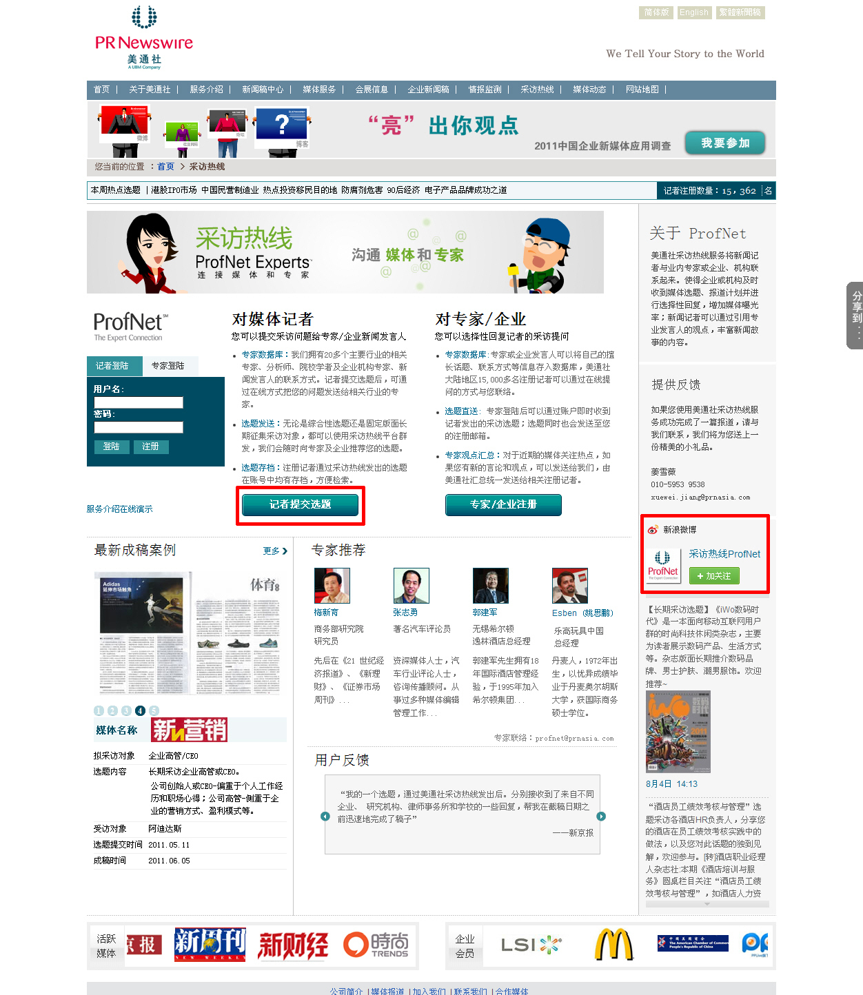 美通社中國區董事總經理陳玉劼說:“美通社在2007年將在北美新聞界、公關界人盡皆知皆用的采訪熱線(ProfNet)平臺引入中國,為中國的媒體與專家、企業搭建起一個快速溝通的橋梁,新版采訪熱線結合中國最流行的微博等社交媒體工具,充分發揮了采訪熱線的社交互動優勢,為媒體和專家、企業新聞發言人提供更實時、便捷的溝通交流平臺?!?/p>