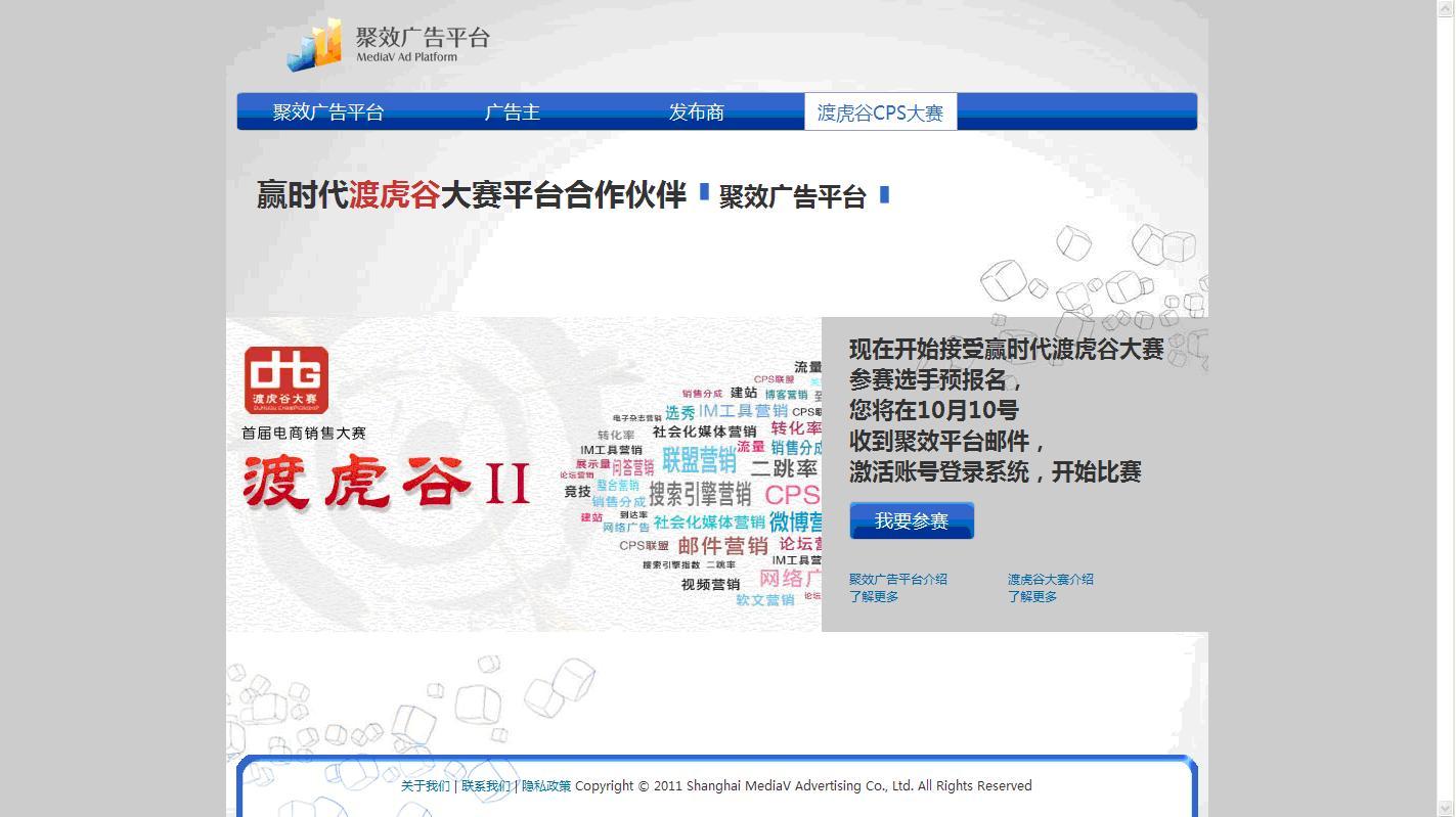 北京2011年10月11日電 /美通社亞洲/ -- 領先的數字廣告及增值服務提供商 MediaV 即將推出旗下全新智能精準效果營銷平臺 -- 聚效廣告平臺,于10月10日正式啟動接受報名。MediaV 聚效廣告平臺(http://ju.mediav.com/duhugu )首次揭開神秘面紗,將通過此次渡虎谷 CPS 大賽誠邀各位廣告主及網站主一起感受和見證智能精準廣告技術的魅力。