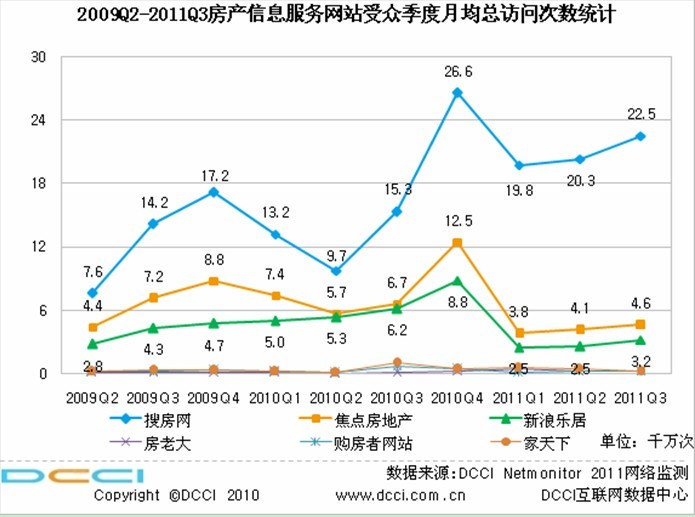 北京2011年10月24日電 /美通社亞洲/ -- DCCI 互聯(lián)網(wǎng)數(shù)據(jù)中心發(fā)布的《2011Q3中國房地產(chǎn)行業(yè)專項(xiàng)數(shù)據(jù)監(jiān)測(cè)報(bào)告》日前出爐。該報(bào)告分析指出,搜房網(wǎng)各項(xiàng)統(tǒng)計(jì)指標(biāo)在2011年第三季度仍然保持著行業(yè)的絕對(duì)領(lǐng)先優(yōu)勢(shì),與二季度相比,大量指標(biāo)還有不同程度的增長。