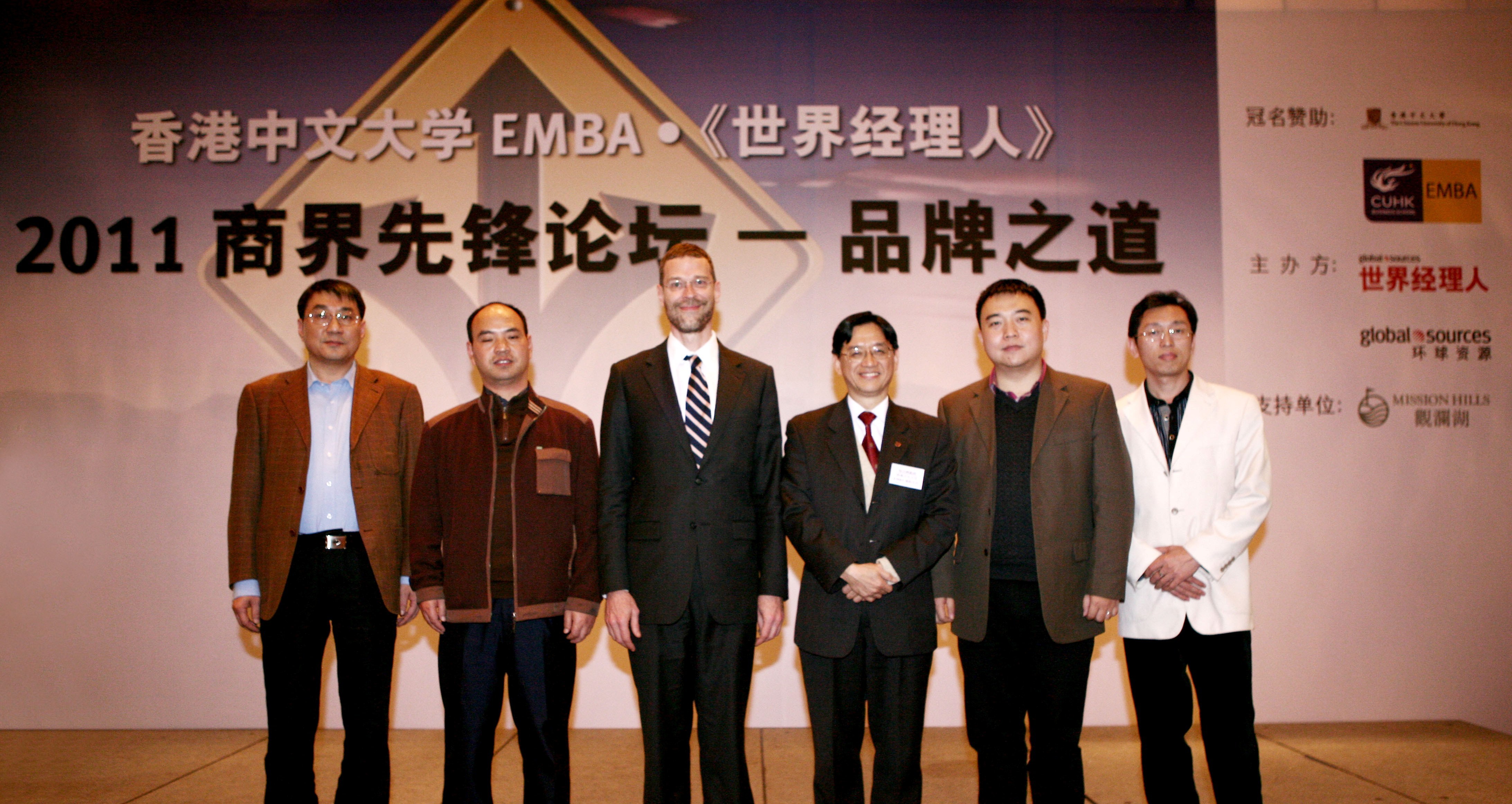 論壇主辦方環球資源企業事務總裁兼《世界經理人》雜志出版人裴克為先生(左三)、聯合主辦方香港中文大學EMBA課程主任陳志輝教授(右三)與其他嘉賓在“2011商界先鋒論壇—品牌之道”活動上合影。