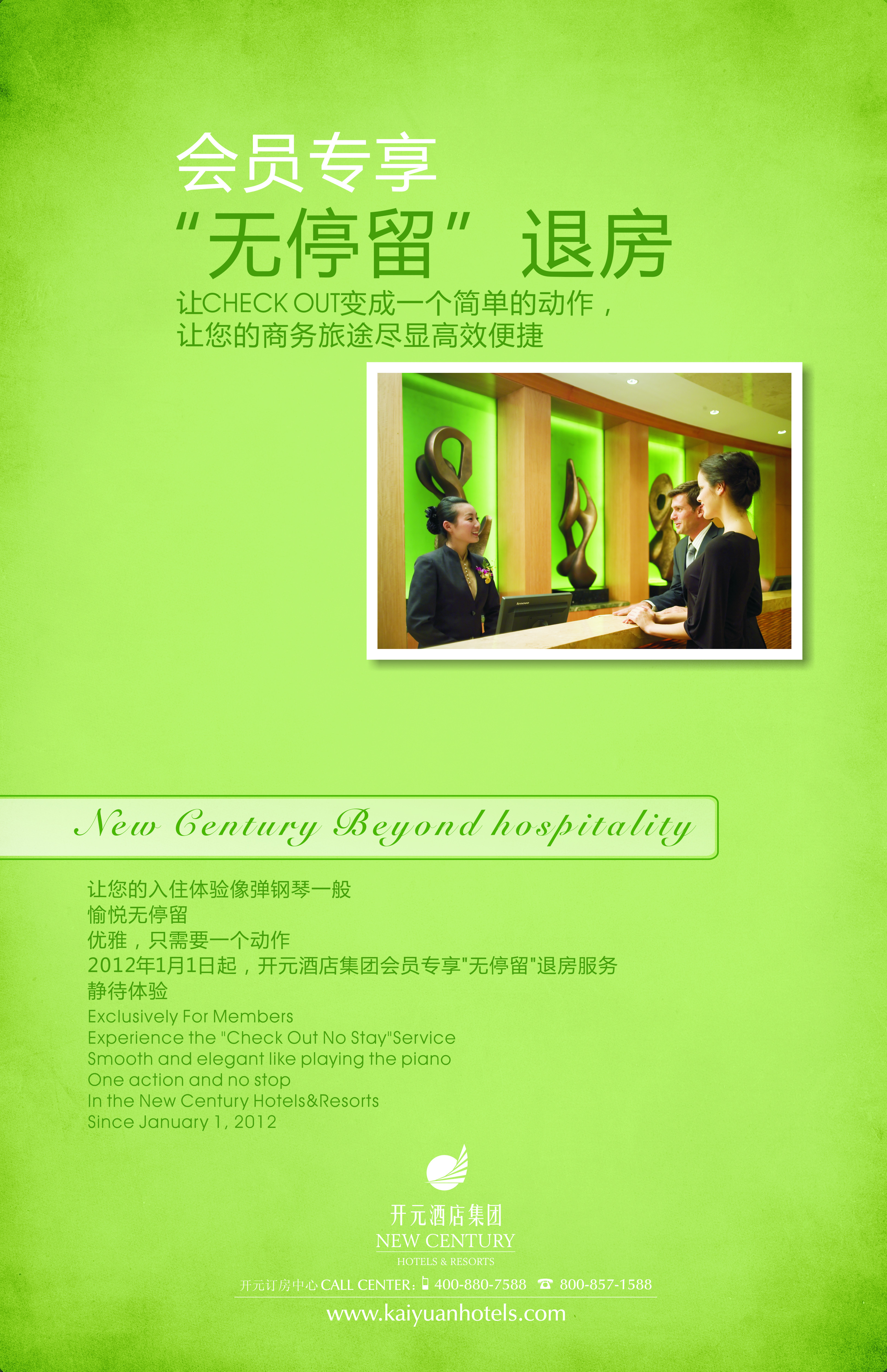 “無停留退房”服務計劃是開元酒店集團針對商祺會會員在退房時推出的快捷服務,是指在現有免查房服務的基礎上,為客人提前結清所有費用,完成結賬手續,賓客在退房時只需將房卡歸還至前臺即可離店。這一人性化的服務推出旨在提升開元商祺會會員禮遇及附加值,亦是突出開元人性品質、真摯關愛的品牌核心價值。