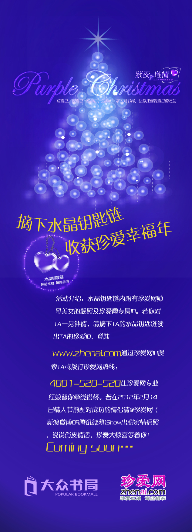 2012年即將來臨,孤獨的單身男女是否仍然徘徊在愛情的門外?不妨來到這顆圣誕愛情樹下尋找自己的心儀對象,摘下TA的心形水晶鑰匙鏈,或許就是美妙情緣的開始。