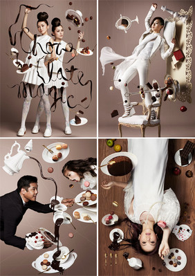 巧克力的魔力令人難以抵擋,若把大家對巧克力的幻想以視覺手法呈現眼前,又會是怎樣的呢?日本創意團隊NAM由設計師中澤貴之(Takayuki Nakazawa)和攝影師間仲宇(Hiroshi Manaka)組成,作品充滿幻想,并致力追求"Fantasy in Life"的主題。NAM把這個主題融入巧克力中,并把大家對巧克力的幻想以超現實的手法,在BiBi周筆暢、Twins (蔡卓妍及鐘欣桐)、鄧紫棋G.E.M.及黑人陳建州身上體現。此輯照片由即日至2012年2月19日于海港城港威商場大堂I及II展出,讓大家一同墮進兩位日本大師的‘Chocolate Magic巧克力魔法’中。