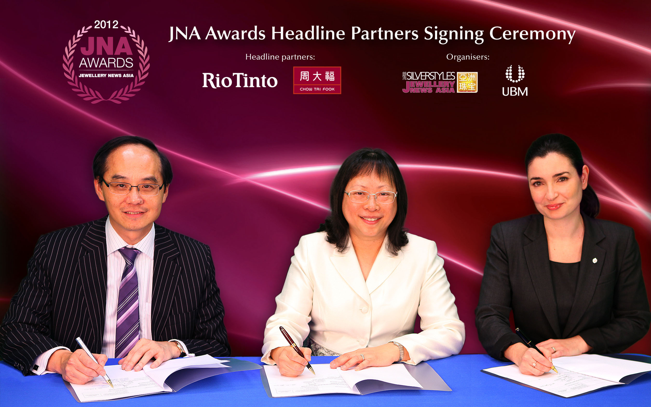 《亞洲珠寶》創(chuàng)刊人暨亞洲博聞珠寶業(yè)業(yè)務(wù)拓展總監(jiān)周美麗女士(中),聯(lián)同周大福珠寶集團(tuán)有限公司董事總經(jīng)理黃紹基先生(左)和Rio Tinto鉆石部 - 市場(chǎng)及銷(xiāo)售大中華代表處經(jīng)理馬麗詩(shī)小姐(右)簽署JNA大獎(jiǎng)首席合作伙伴合約