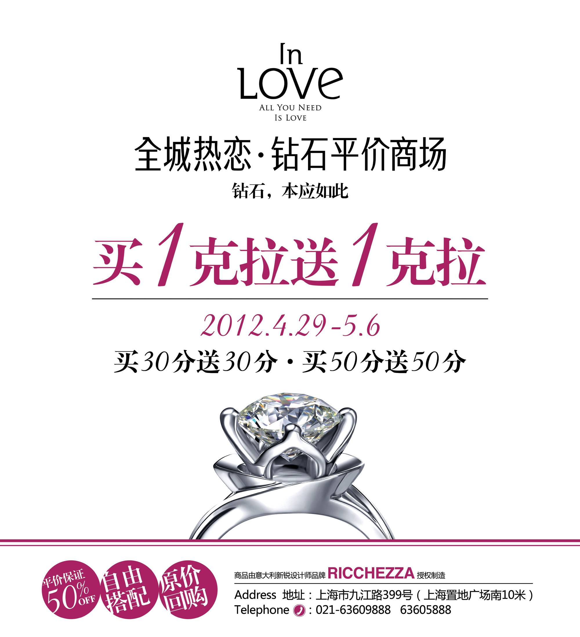 上海2012年4月26日電 /美通社亞洲/ --自3月開業(yè)首日創(chuàng)造中國鉆石行業(yè)較高單日銷售紀(jì)錄之后,上海全城熱戀鉆石平價(jià)商場不斷推出的各種重磅促銷活動(dòng),掀起了消費(fèi)者們對(duì)奢侈品快消的“全城熱戀”。繁多的品類、超低的價(jià)格和優(yōu)質(zhì)的特色服務(wù)讓這個(gè)正在發(fā)展中的時(shí)尚品牌被大眾所熟知。五一“嫁”期到來之際,全城熱戀鉆石平價(jià)商場震撼推出鉆石買一克拉送一克拉的瘋狂促銷之舉。