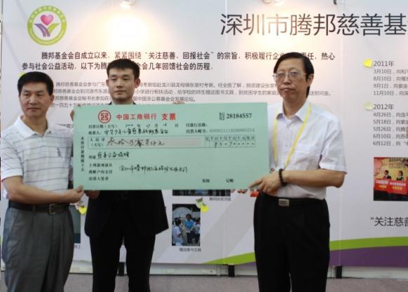 廣東省民政廳民間組織管理局副局長王世國(左)深圳市騰邦物流股份有限公司副總裁黃鏡愷(中)和中華少年兒童慈善救助基金會秘書長王林(右)舉行了簡短的善款捐贈儀式