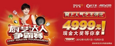 此外,10月1日至10月31日之間,沃爾瑪還將推出“廚藝達人爭霸賽”之“網上人氣之王評比”。所有門店初賽的冠軍比賽照片,將由沃爾瑪直接上傳到活動網站,進行網絡投票。其他網友亦可登陸活動網站 www.wmhuodong.com,點擊“廚藝達人爭霸賽”,將菜肴烹制過程的照片上傳(提交菜式不限數量),與所有門店初賽的冠軍一起,接受網友投票,參與“網上人氣之王評比”。獲得最多投票的選手將獲得一等獎,贏得4999元現金;3名二等獎達人將獲得1000元沃爾瑪購物卡;6名三等獎達人將獲得200元沃爾瑪購物卡(詳情以店內及網絡公告為準,請咨詢門店服務臺)。