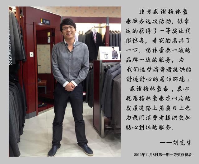 一等獎獲得者劉先生第一時間向格林豪泰表示了感謝:“非常感謝格林豪泰舉辦這次活動,很幸運的獲得了一等獎讓我很驚喜,著實的高興了一下。格林豪泰一流的品牌一流的服務(wù),為我們這些消費者提供的舒適舒心的居住環(huán)境,感謝格林豪泰,衷心祝愿格林豪泰在以后的發(fā)展道路上蒸蒸日上也為我們消費者提供更加貼心到位的服務(wù)。”