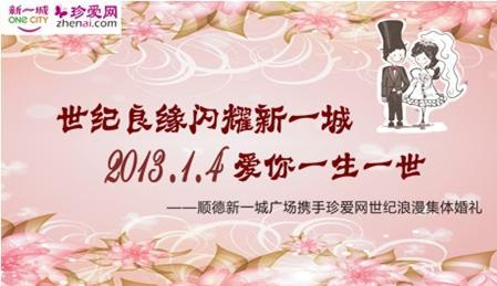 2013年1月4日,順德新一城攜手中國較大的相親網站珍愛網在佛山順德新一城廣場舉辦的“世紀良緣閃耀新一城,2013.1.4愛你一生一世”世紀浪漫集體婚禮即將濃情啟幕,為新人締造一場甜蜜浪漫的世紀回憶。