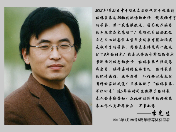 2013年1月28日,格林豪泰酒店管理集團八周年“百萬豪禮感恩回饋”特等獎 -- 別克凱越轎車現場抽獎活動開啟,來自江蘇泰州的季先生抱得轎車歸!此次抽獎活動由慧聰網進行全程監督和公證,并通過格林豪泰官方微博、慧聰酒店網官方微博進行圖文直播。