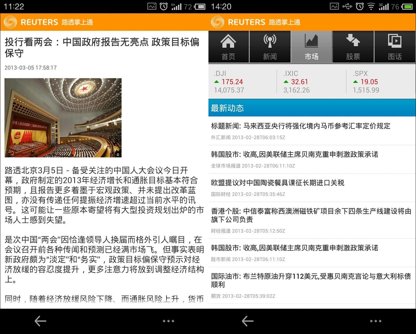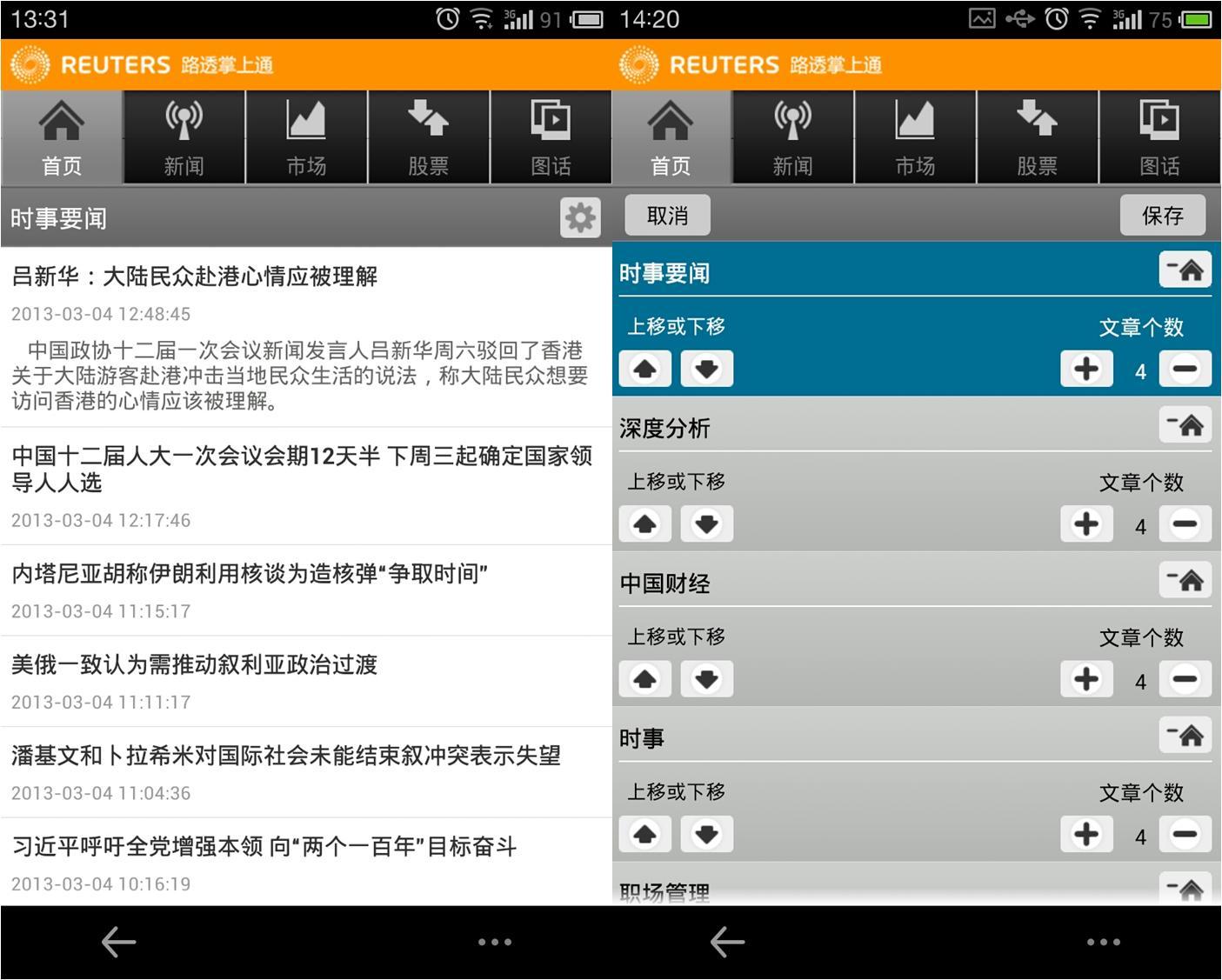 路透中文網“路透掌上通”安卓中文版首頁及個性化功能頁