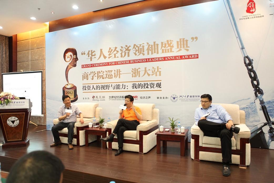 北京2013年5月27日電 /美通社/ -- 5月24日下午,在浙江大學紫金港校區啟真湖畔,一場商界領袖與青年精英們的風云對話進行得如火如荼。值浙江大學建校116周年之際,由鳳凰網、《21世紀經濟報道》、中央人民廣播電臺經濟之聲主辦的“華人經濟領袖盛典”商學院巡講走進了浙江大學管理學院,與位于經濟前沿的浙江大學管理學院的學子們激蕩思想,分享經驗。