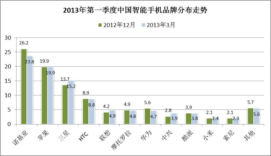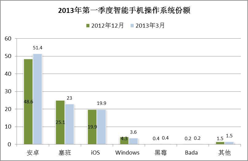 Kantar Worldpanel移動通訊消費者指數的連續性研究發現,第一季度安卓系統在整體智能機市場的份額上升至51.4%,環比上升2.8%。這是安卓系統第一次在中國正式占有超過半數的智能機市場,而二,三位仍然是塞班和iOS系統,市場份額分別為23%和19.9%。較2012年第四季度,塞班系統的市場份額下降了超過2個百分點,但iOS保持不變停留在將近20%的市場份額。按照趨勢推測,在2013年第二至第三季度中,安卓將會繼續擴大在智能機的主導地位,塞班則將讓位給iOS退為第三大智能機操作系統。