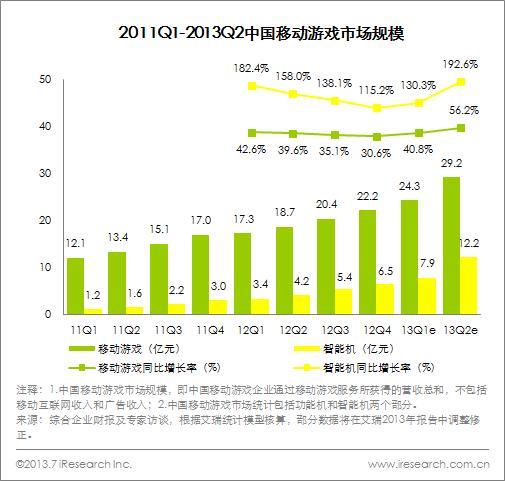 總結(jié):2013Q2網(wǎng)絡(luò)游戲依托移動(dòng)游戲和網(wǎng)頁(yè)游戲的快速擴(kuò)張,市場(chǎng)規(guī)模不斷增加,尤其今年是移動(dòng)游戲如火如荼來(lái)勢(shì)洶洶的一年。