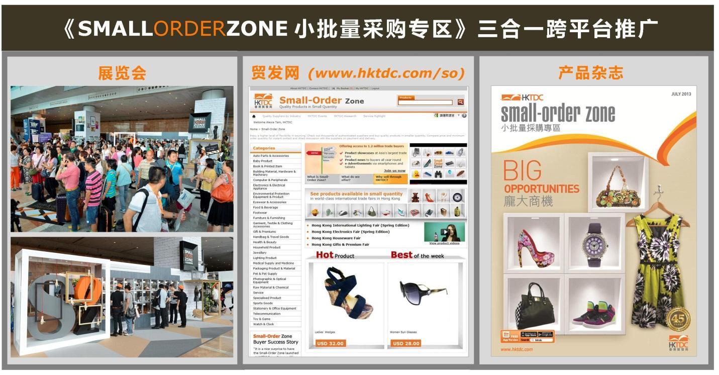 香港貿發局的《小批量采購專區》推廣計劃結合了貿發局的展覽會、電子商貿平臺“貿發網”、和多媒體產品雜志三大平臺,全方位接觸小批量買家。