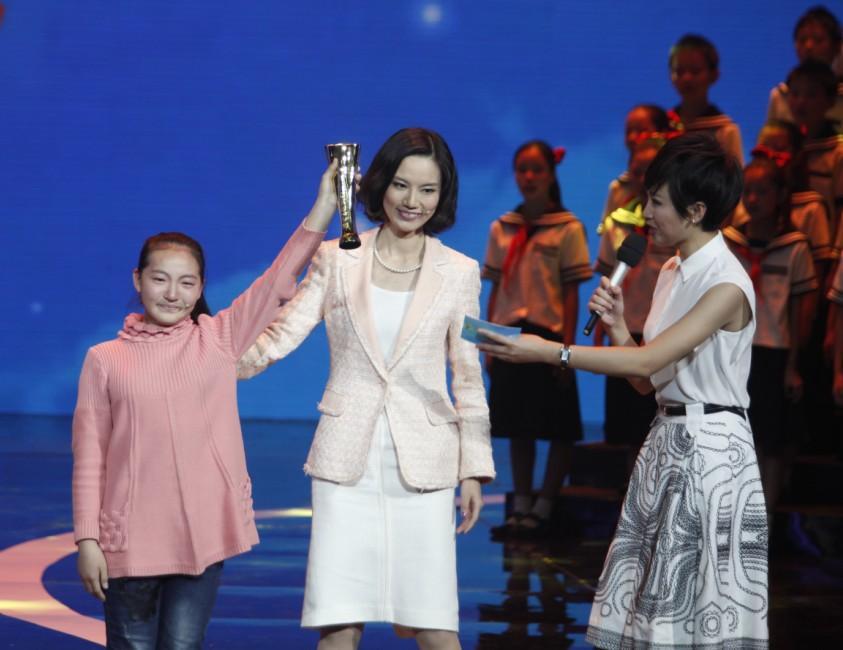 伽藍(lán)集團(tuán)對外事務(wù)高級總監(jiān)趙曼麗(中)代表自然堂品牌為最美孝心少年高雨欣頒獎
