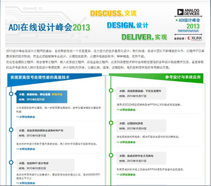 在接下來的活動中,ADI 2013在線設計峰會將安排共6場高水準的在線研討會,包括ADI專家團隊帶來的實現(xiàn)更高信號處理性能與參考設計和系統(tǒng)應用為主題的技術指導,如“數(shù)據(jù)與電源隔離”、“系統(tǒng)分割與設計”、“液體與氣體檢測”等精彩主題,活動合作伙伴Xilinx還將展示他們基于ADI模擬和混合信號技術的領先解決方案。關注這些熱門主題的中國工程師們現(xiàn)在即可登陸ADI 2013在線設計峰會官方頁面并注冊參會,精彩不容錯過。本次峰會全部結(jié)束后,ADI還將貼心的對所有主題研討會的視頻和技術資源進行為期四個月的在線展示,讓錯失某期話題研討的工程師們不留遺憾。