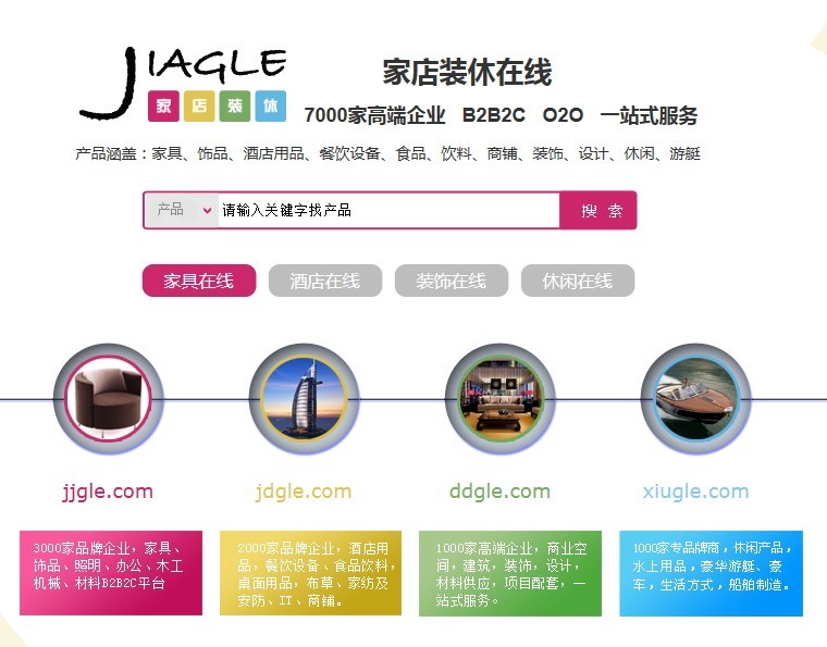 家店裝休網(wǎng)(http://www.jiagle.com)是博華深度整合公司旗下家具FUR、酒店HOTELEX、建筑裝飾裝潢設(shè)計Design & Deco、休閑/游艇Boat & Lifestyle 四大板塊線上展會和線下B2B網(wǎng)站資源而建立的集B2B2C和O2O為一體的一站式在線貿(mào)易采購平臺。其分設(shè)的家具在線JJGLE,酒店在線JDGLE,裝飾在線DDGLE和休閑在線XIUGLE為7000家高端企業(yè),近20萬專業(yè)觀眾及需要大批量采購各類中高端酒店用品、家具家居、配套裝飾解決方案、休閑產(chǎn)品的酒店、餐廳、商業(yè)地產(chǎn)、網(wǎng)店店主等提供線上對口產(chǎn)品的搜索、查詢、咨訊、交易和配套增值服務(wù)。